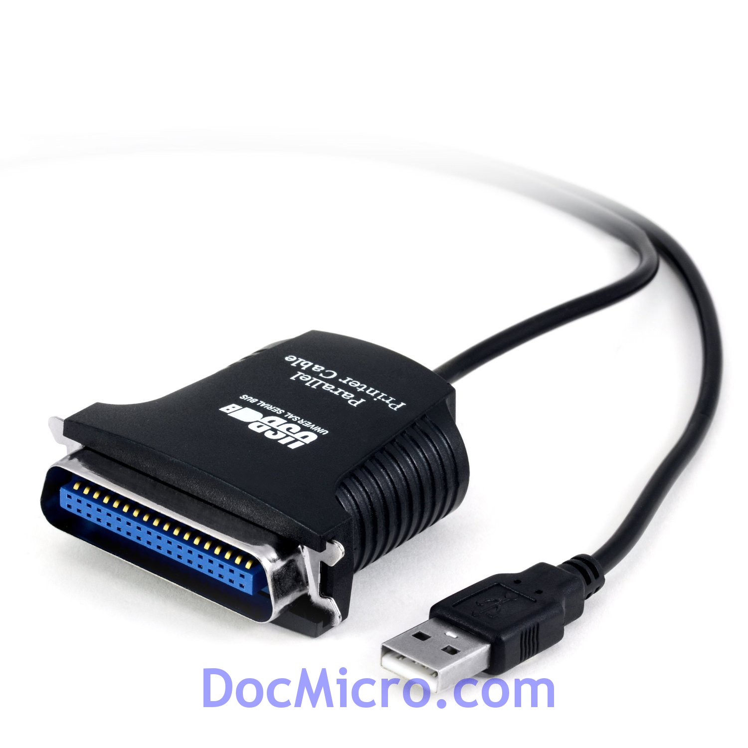 L'adaptateur est équipé d'une prise USB A et d'un port LPT parallèle 36 broches à l'autre extrémité.