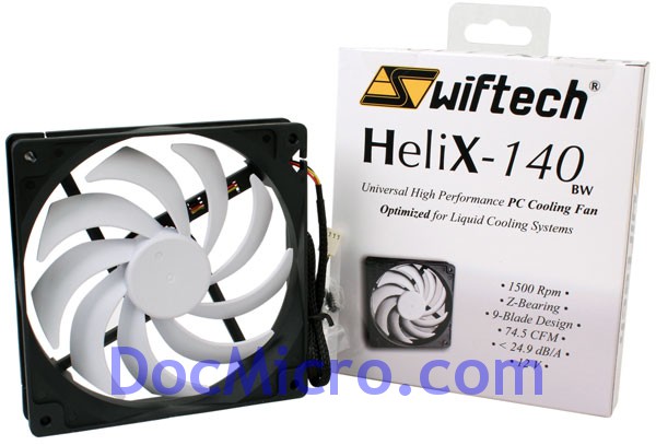 Le ventilateur de 140mm Helix a été spécialement optimisé pour le refroidissement liquide et possède une excellente pression statique et émet un faible bruit grâce à ses 9 pales.