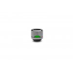 The locking ring prevents solid tube to be pulled out of the fitting by compressing the rubber gasket underneath the ring. The grooves on the outside allow for easier hand tightening. The compression ring has cutouts in EK Quantum signature shape allowing for the colored aesthetic ring to be shown. The colored rings are available in many colors and are screwed onto the fitting before the compression locking ring. The aesthetic rings are sold separately.