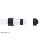 L'assemblage des raccords Eiszapfen PRO est très similaire aux autres raccords. La nouvelle pièce est l'insert en nylon qui est inséré à l'extrémité du tube rigide. L'écrou-raccord est d'abord poussé sur le tube puis le joint de compression. Ensuite, l'insert en nylon est mis. Maintenant, le raccord est vissé comme d'habitude. Pour rendre cela encore plus facile, il y a un évidement un creux à six pans dans le trou de la partie inférieure du raccord, cependant, soyez toujours prudent lorsque vous utilisez des outils avec des raccords car un effet de levier trop important peut endommager les blocs.