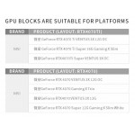 This full coverage block directly cools the video cards core (GPU), graphics memory (RAM), and voltage regulator modules (VRM). By directly cooling these components, you can achieve great temperatures along with the ability to reach higher overclocks or extend the overall lifespan of your card by running at below factory temps.