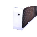 Toutes les pièces principales, non seulement les ailettes et les canaux, mais les chambres sont également fabriqués à partir de cuivre. Cela apporte une amélioration de la performance du radiateurs. Les chambres séparées donnent au liquide de refroidissement une direction claire, ce qui permet des débits élevés qui permettent d'améliorer les performances de l'ensemble du circuit de refroidissement.