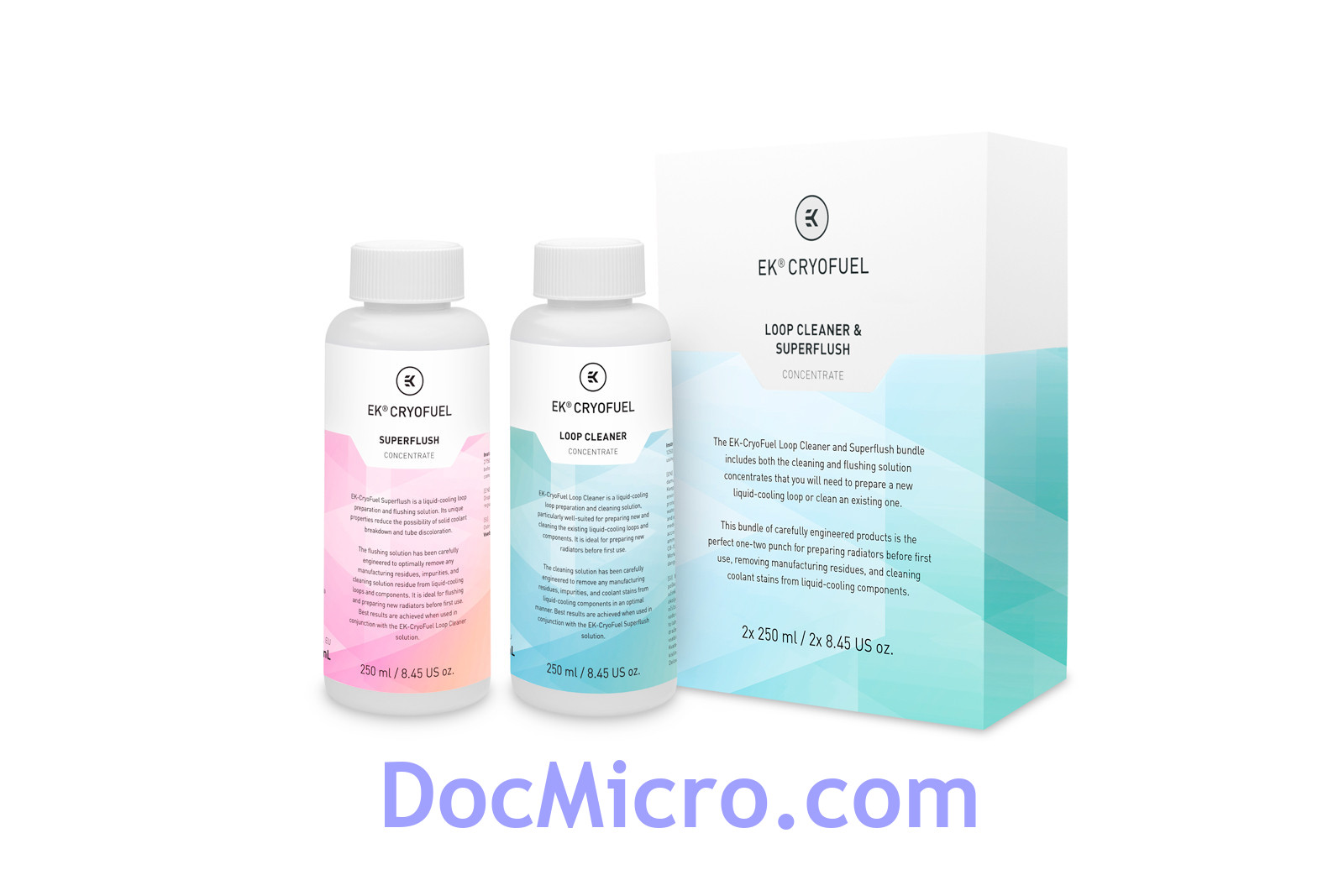 EK-CryoFuel Loop Cleaner + Superflush is a safe and reliable loop-cleaning and flushing kit. It has been developed to clean your used custom water cooling loop or prepare a new one, leaving it free of any impurities or manufacturing residues. It consists of two items, of which both are concentrates and require dilution with distilled water before use.