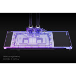 Le design Aurora de la génération Radeon RX 7XXX Eisblock est visuellement plus calme et plus simple. Un seul joint torique fait le tour de l'ensemble du refroidisseur. La conception autour des ailettes de refroidissement et de la plaque de jet donne un look plus propre. L'éclairage des LED RVB adressables numériquement est encore mieux réparti dans le refroidisseur grâce au chromage. La conception du terminal est conforme au design classique d'Aurora.
